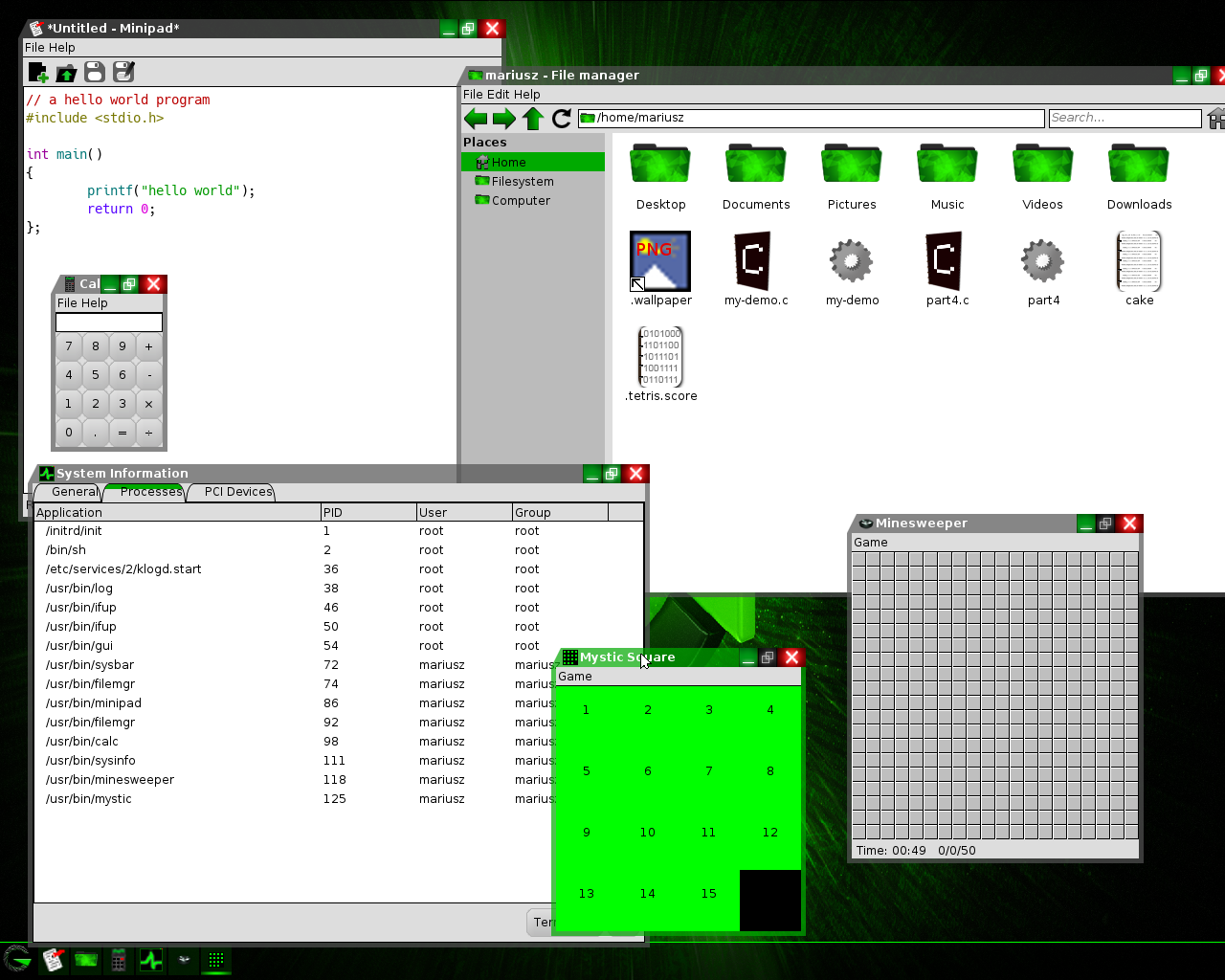 Glidix is an operating system in development since late 2014, originally to help me understand how things work. It has since then progressed, and is now a relatively functioning, graphical operating system, although it still needs a lot of work before it can be fully useable. It is currently in pre-alpha stage, there are lots of bugs, and a lot of missing features; however, it's also fun to play with. It even comes with a few games!